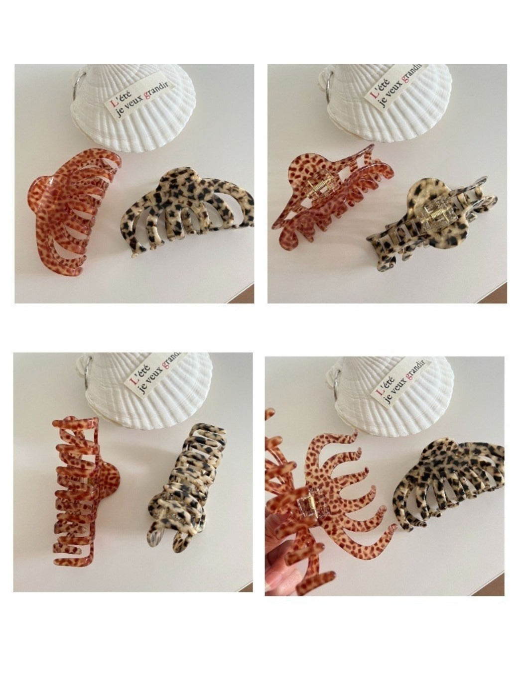 - Layered clip look combining patterned and tortoiseshell finishes; short video demos available