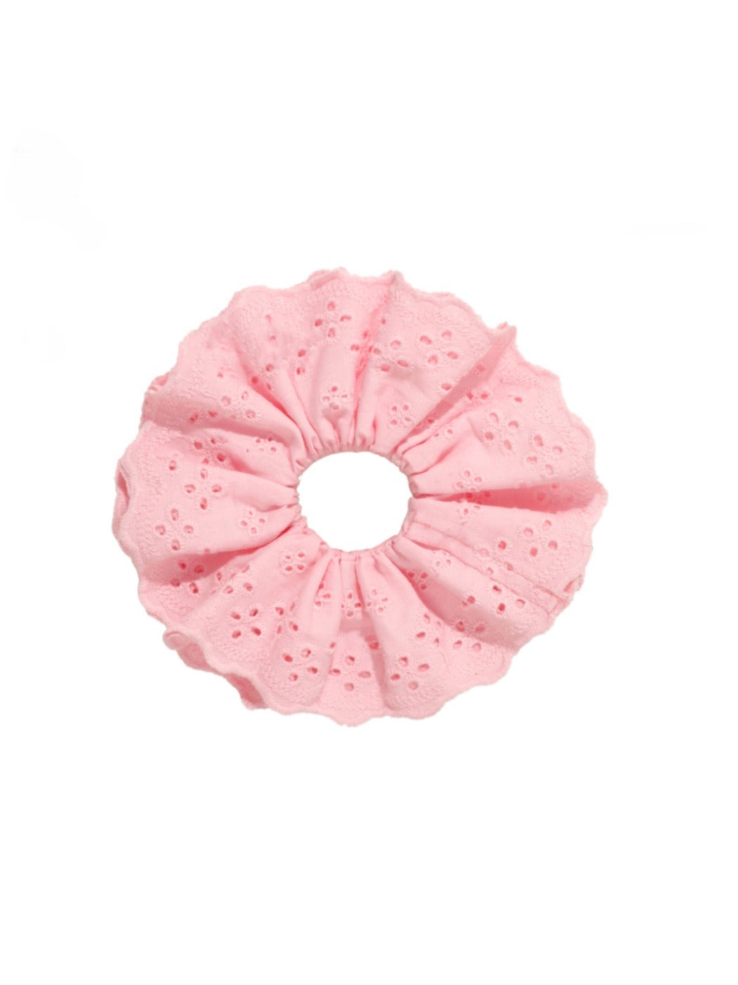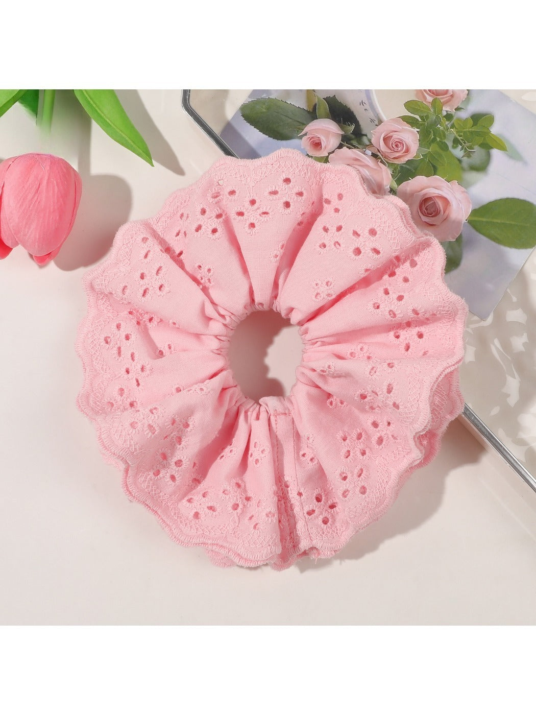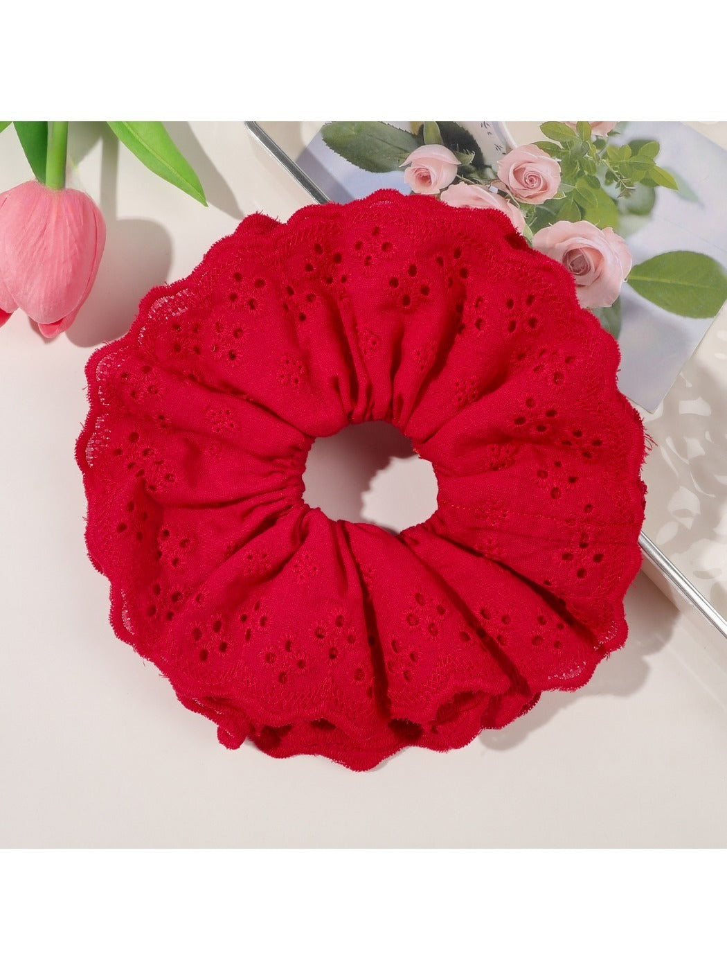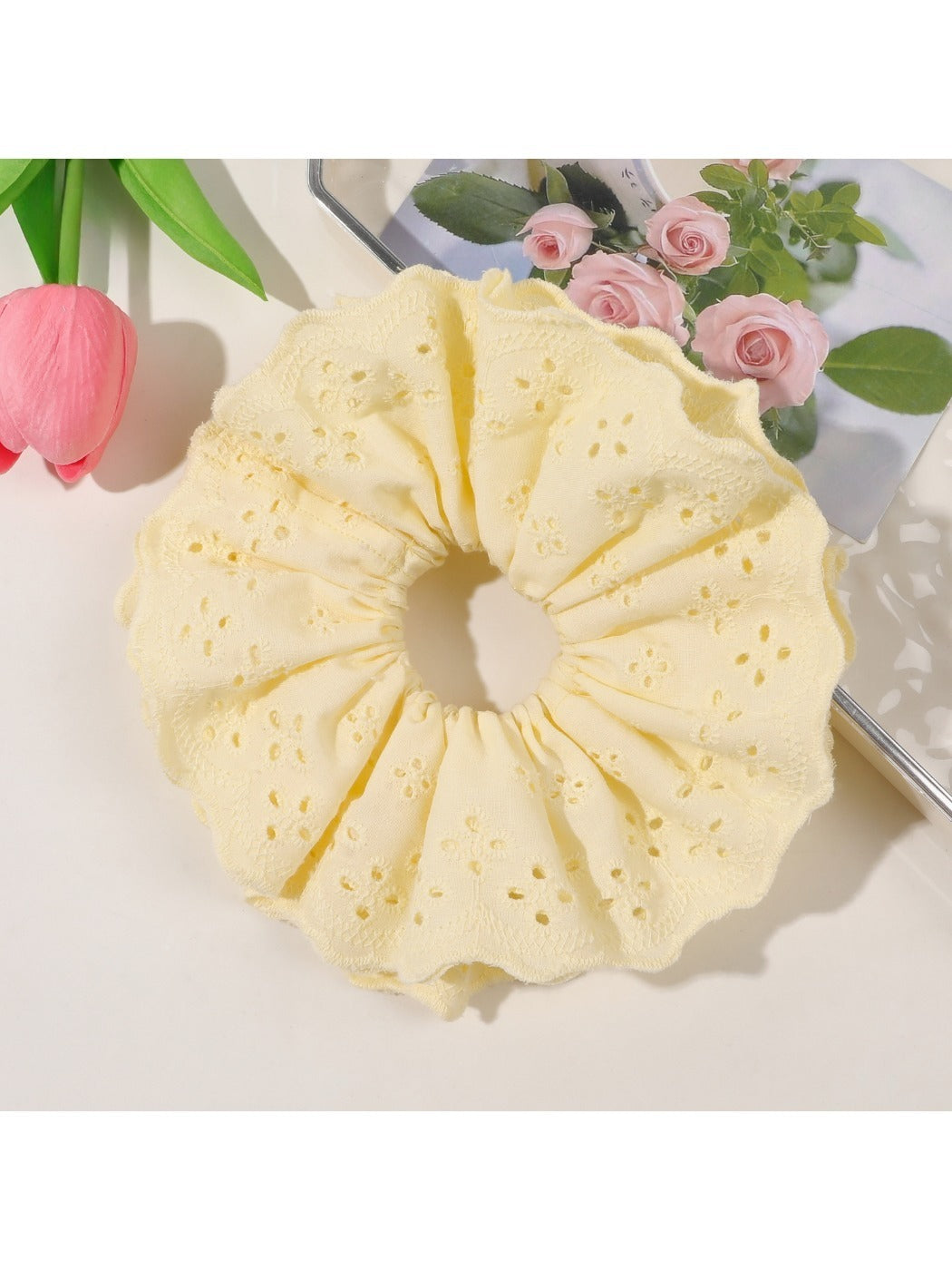 Cream lace hair loop adds neutral elegance to various styles.