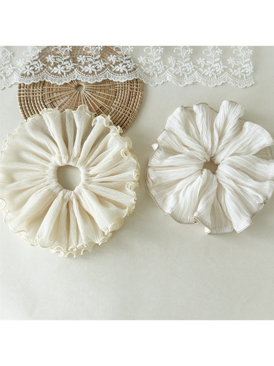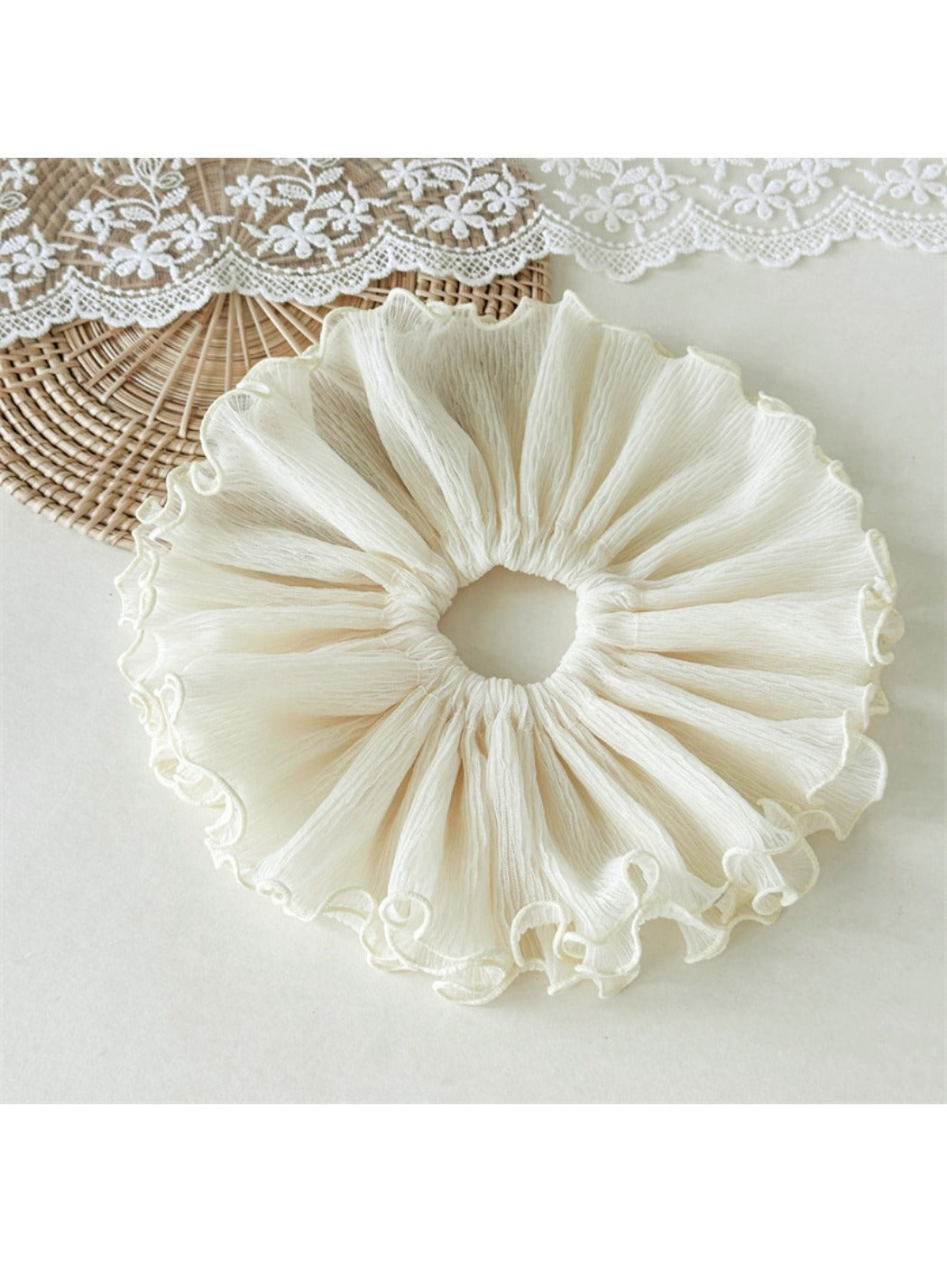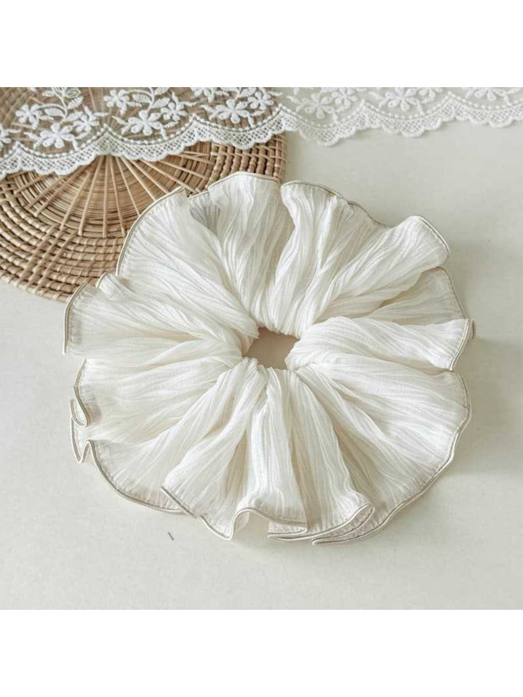 The folded curled edge and smooth fabric reduce friction and visible creases while easing tension on strands. A stretchy, secure fit holds buns, ponytails and half-up knots without tightness. The oversized, luxe finish adds volume to styles while remaining light enough to wear on the wrist between looks. Explore coordinating pieces at /collections/hair-accessories and a styling guide at /blogs/tutorials/sculptural-bun.