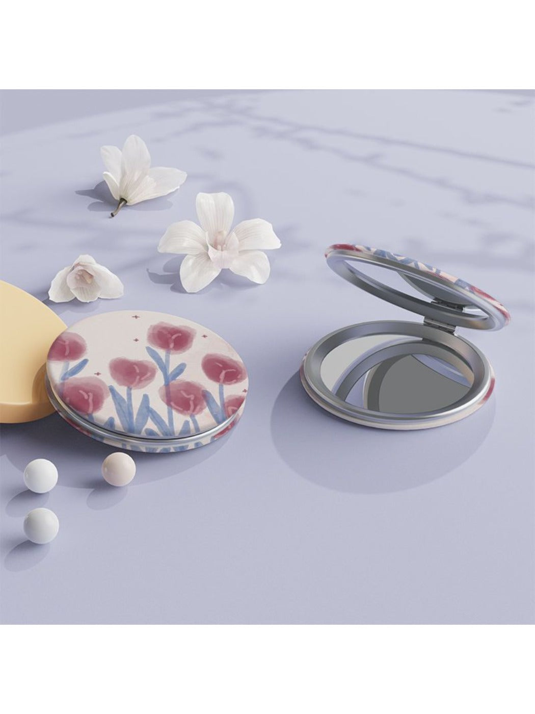 Size: Approximately 7.3 x 6.9 cm. Weight: ~75 g. Material: ABS frame. Shape: Round. Pattern: Tulip.