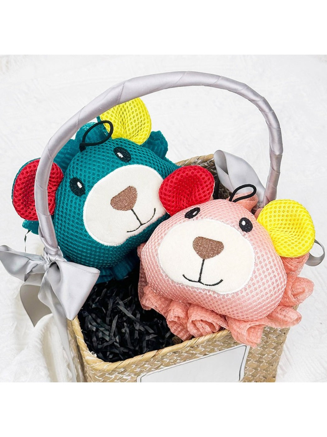 Q: Material? A: Bear bath pouf made from synthetic fiber mesh; durable and quick-dry. Not for ingestion.