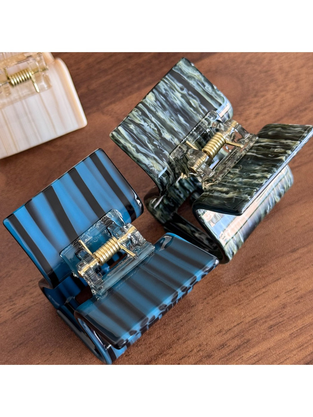 An elegant acetate ponytail clip designed for secure, lightweight updos. The textured striped acetate surface adds subtle shine while smooth rounded edges protect hair. Ideal for ponytails and updos.